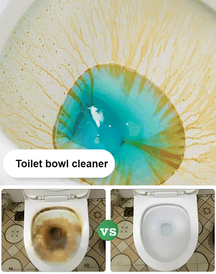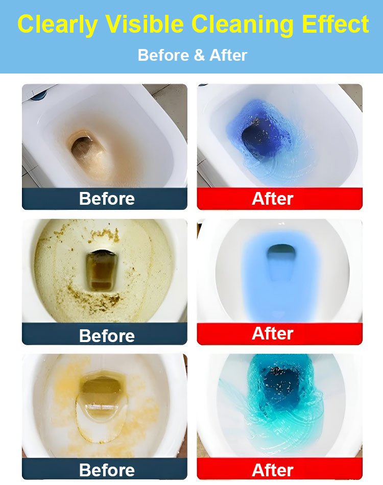 ✨ Images : gros plan du produit placé dans le réservoir des toilettes + images comparatives avant et après.